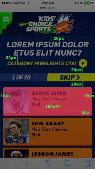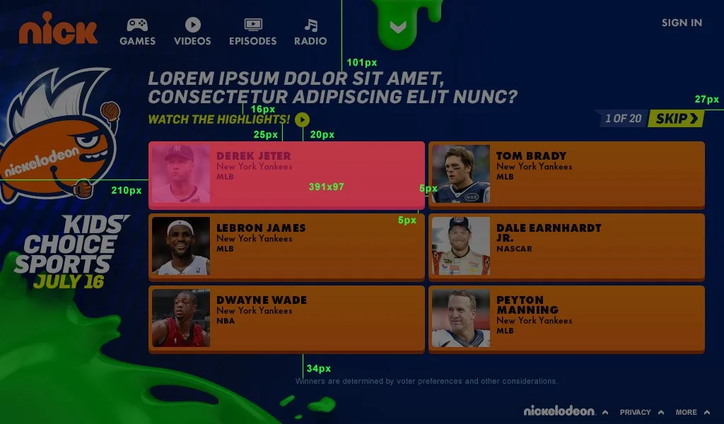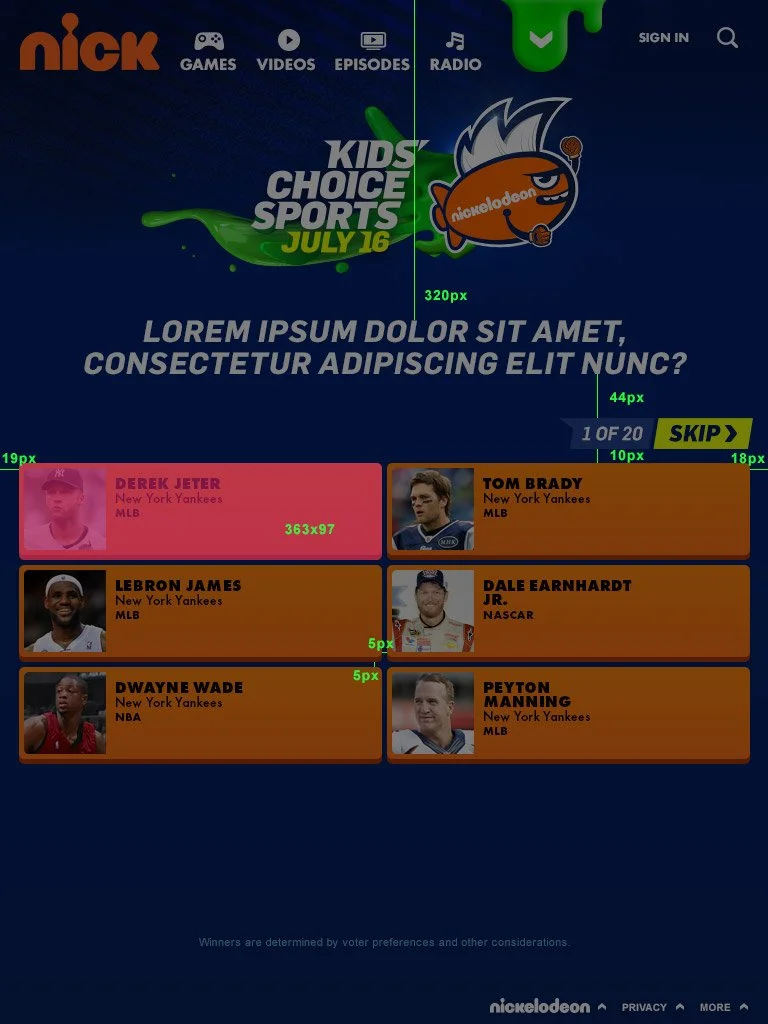 We supported the voting experience on the Nick apps and website. Wires were designed by the UX for all scenarios and events, including live voting during the award show, DOS (Day of Show) photo stream, ad interstitials, and thank you screens.