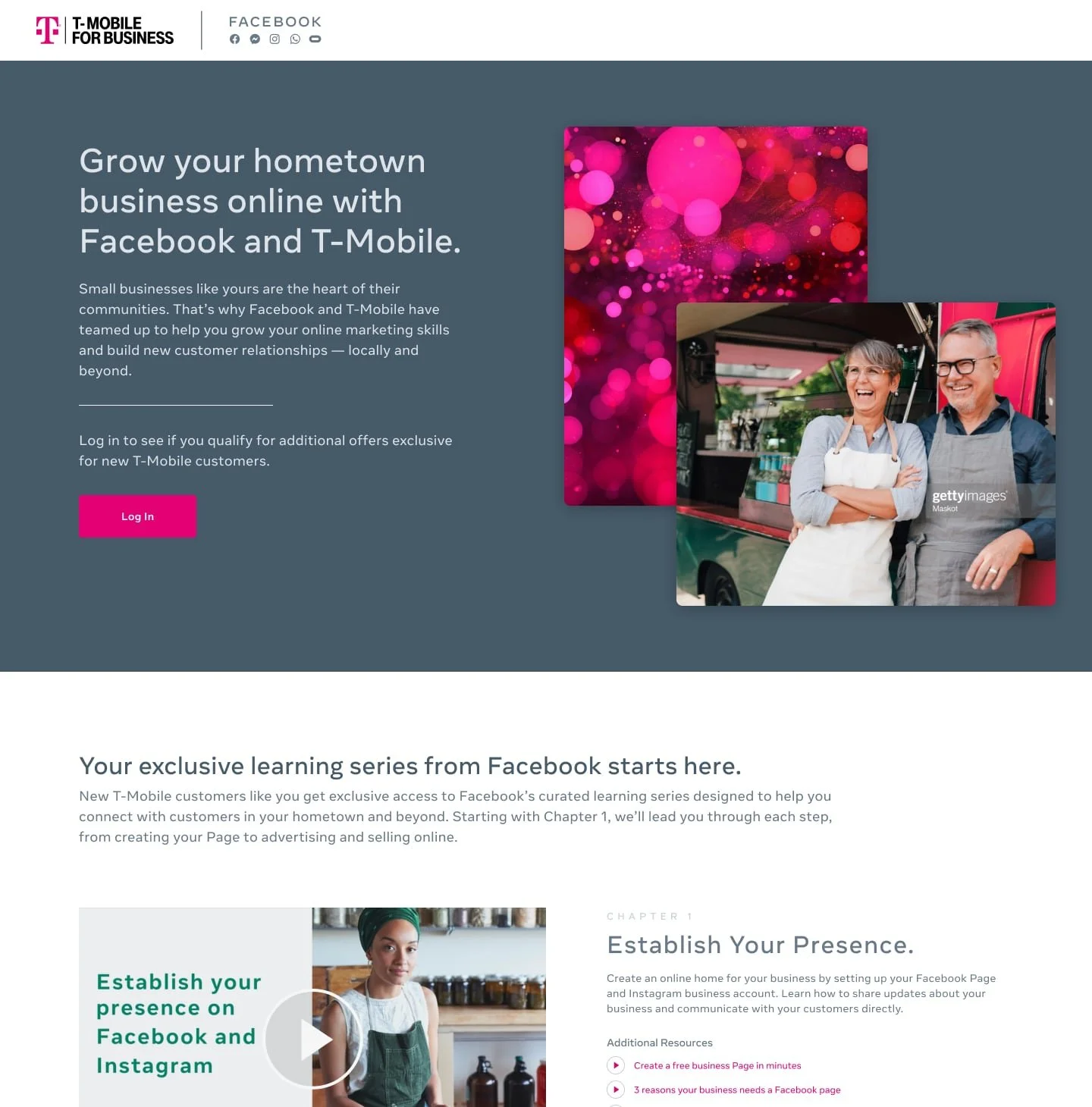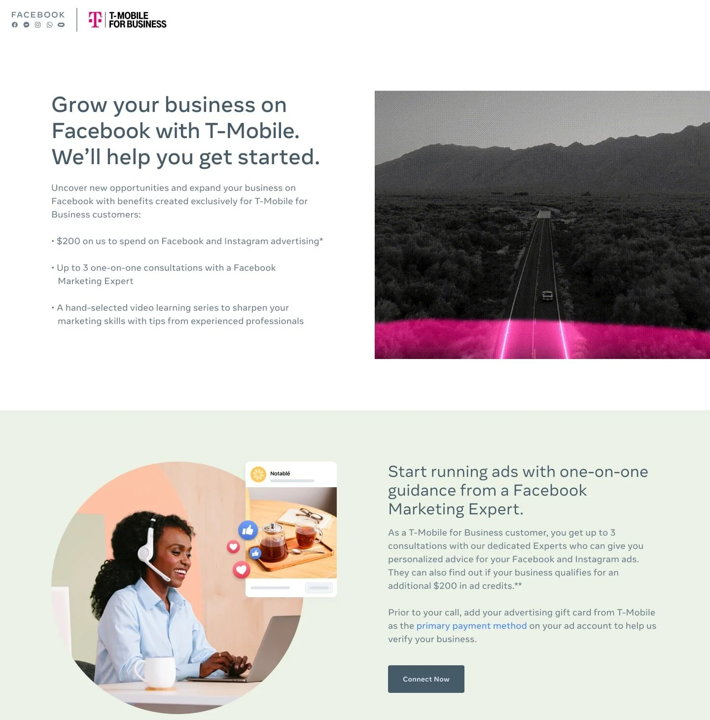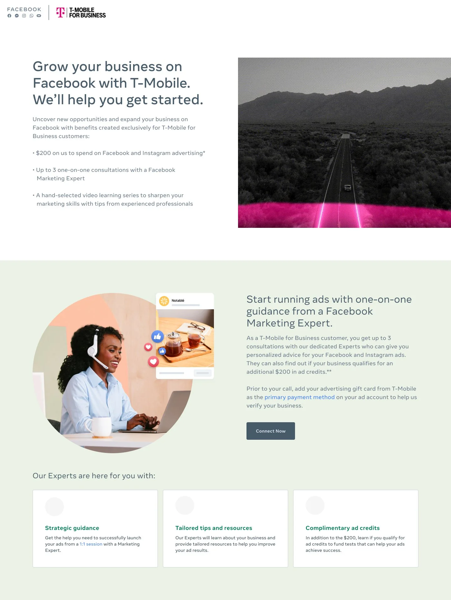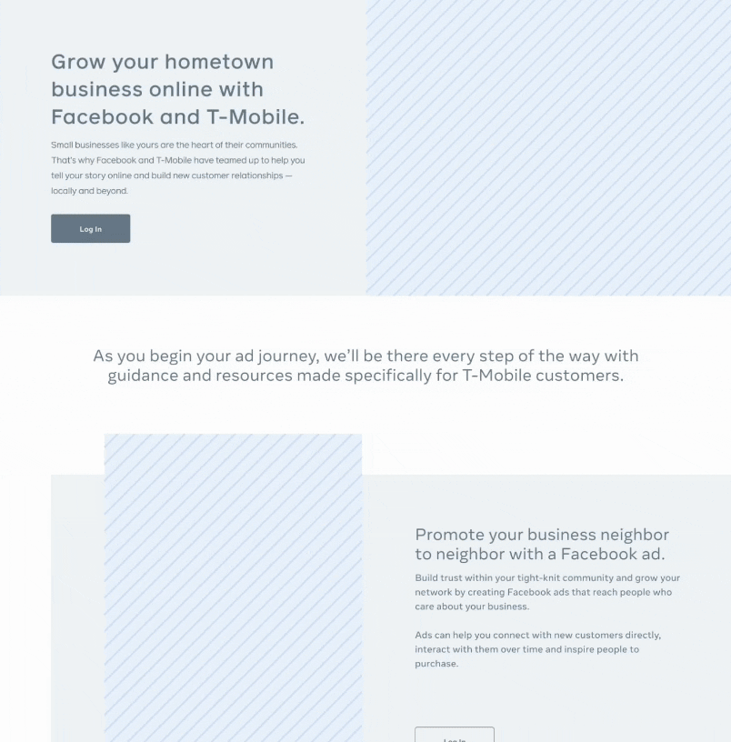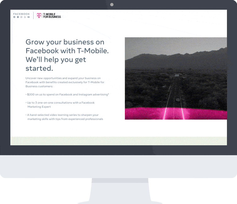 On assignment with Meta (formerly Facebook), within the Small Business Marketing team, we were given a partnership with T-Mobile on their large scale acquisition campaign to help rural SMBs advertise. The partnership included an exclusive offer of free ad credits to use on Facebook ads and educational content for their new customers that sign up.